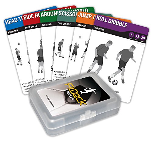 Change up the drills in your next workout with this deck of cards featuring 56 workouts for soccer. The cards include information such as instructions for beginner, intermediate, and advanced players. By going to the product page linked here, you can also select these cards for activities ranging from Navy Seal training to cross training to office exercise.